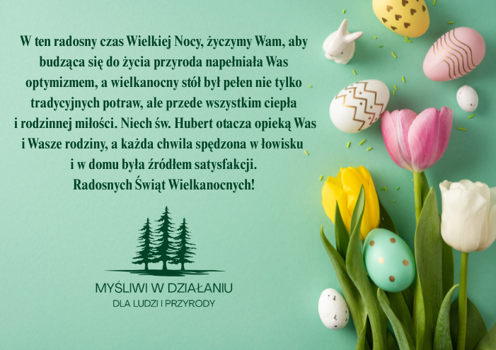 W ten radosny czas Wielkiej Nocy, życzymy Wam, aby budząca się do życia przyroda napełniała Was optymizmem, a wielkanocny stół był pełen nie tylko tradycyjnych potraw, ale przede wszystkim ciepła i rodzinnej miłości. Niech św. Hubert otacza opieką Was i Wasze rodziny, a każda chwila spędzona w łowisku i w domu była źródłem satysfakcji.