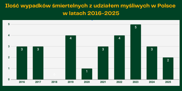 W ciągu ostatnich 10 lat, w całej Polsce wydarzyły się 28 (słownie: dwadzieścia osiem) wypadki śmiertelne myśliwych i z ich udziałem. Każdy wypadek to tragedia i nie powinien się zdarzyć ale oznacza to, że w ostatnich latach nie wydarzyło się więcej niż 5 (słownie: pięć) wypadków rocznie.
