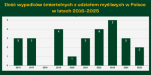 Jak wynika z badań zdecydowana większość Polaków popiera myśliwych i dostrzega ich kluczową rolę w ochronie przyrody oraz zarządzaniu populacją dzikich zwierząt. To dowód na rosnącą świadomość społeczną w zakresie … - Jaka była ilość wypadków śmiertelnych z udziałem myśliwych w Polsce w latach 2016-2026?